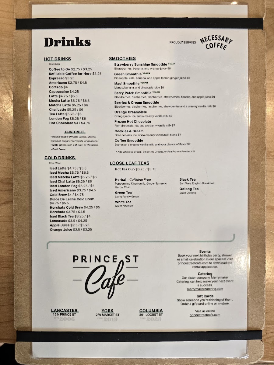 Prince Street Cafe offers a thoughtfully curated menu that fits perfectly with its cozy and inviting atmosphere. The selection centers on simple café staples and comforting breakfast and lunch bites, ideal for a relaxed morning start or a casual midday pause.